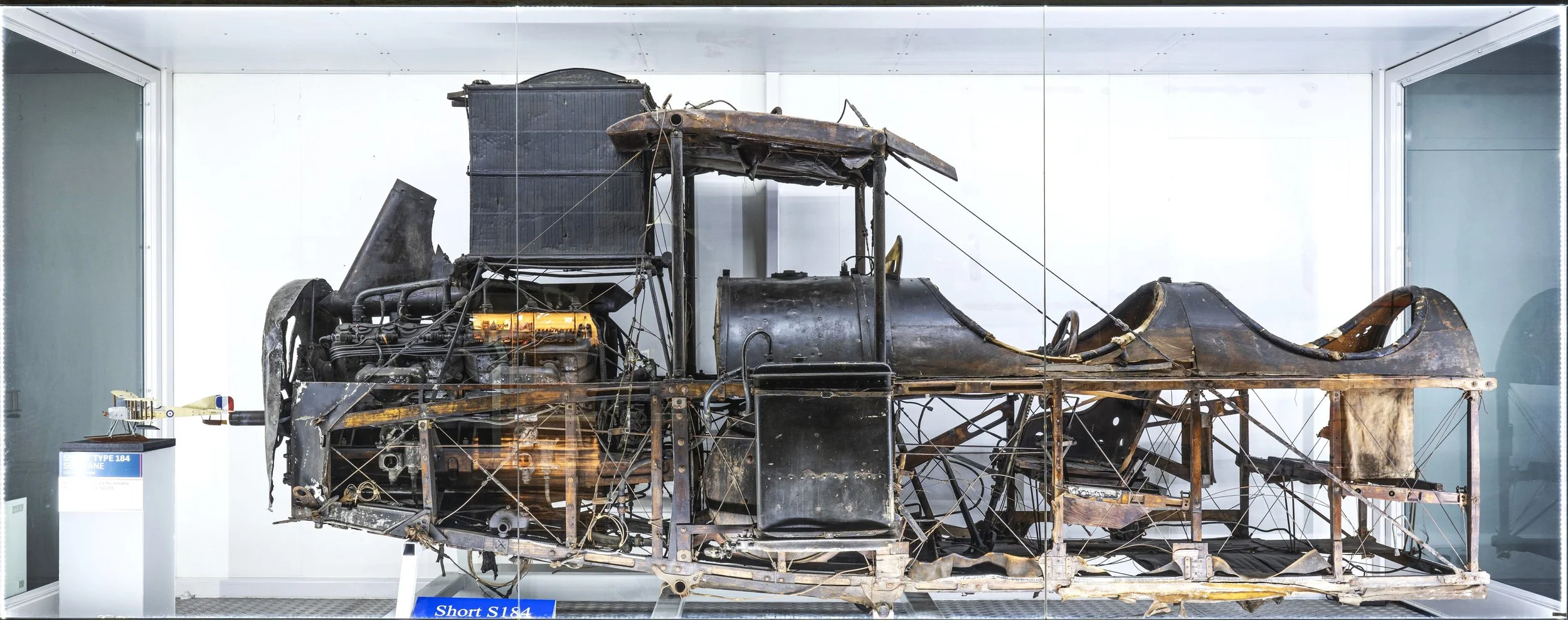 This Short 184, 8359, which is on display in Hall 1, was the only British aircraft to take part in the Battle of Jutland in 1916. It was a ship-based observation plane flown by Flt Lt Frederick Rutland (known forever after as Rutland of Jutland) and he was responsible for locating and reporting four German cruisers. After WWI, the plane was presented (in good condition) to the Imperial War Museum, where it was damaged during the London Blitz. On loan from the Imperial War Museum, it is displayed in the condition it was in after the WWII attack.