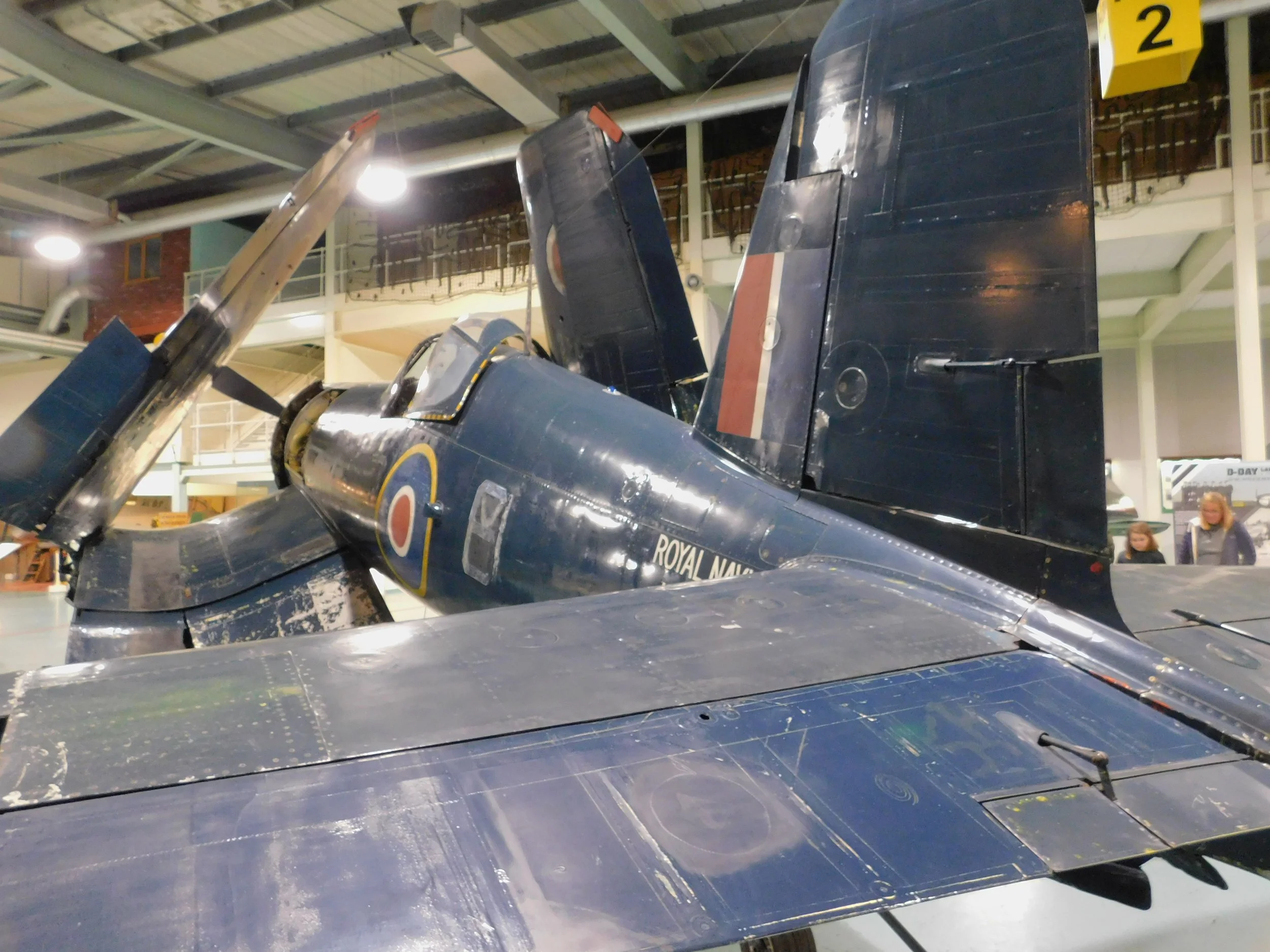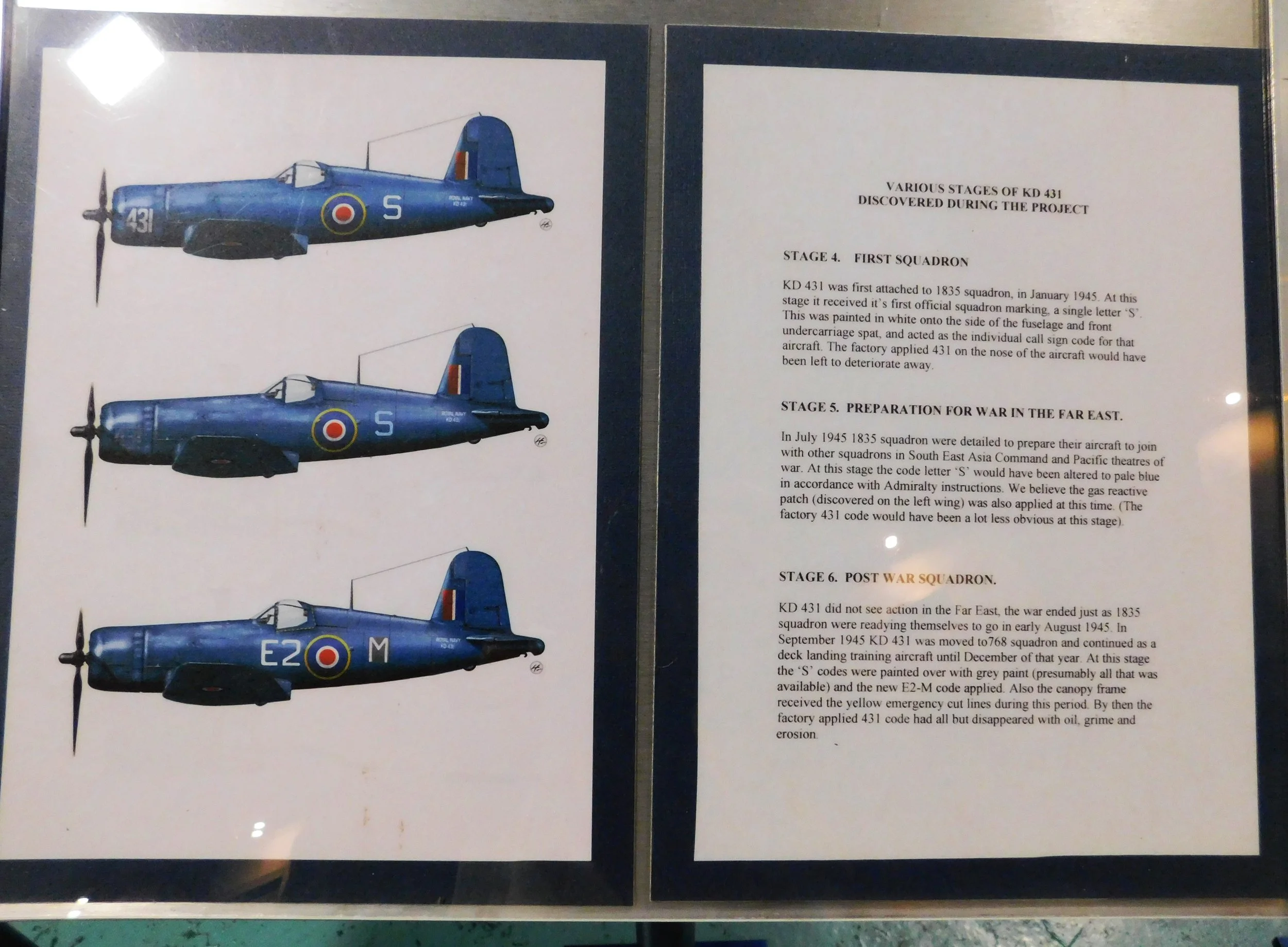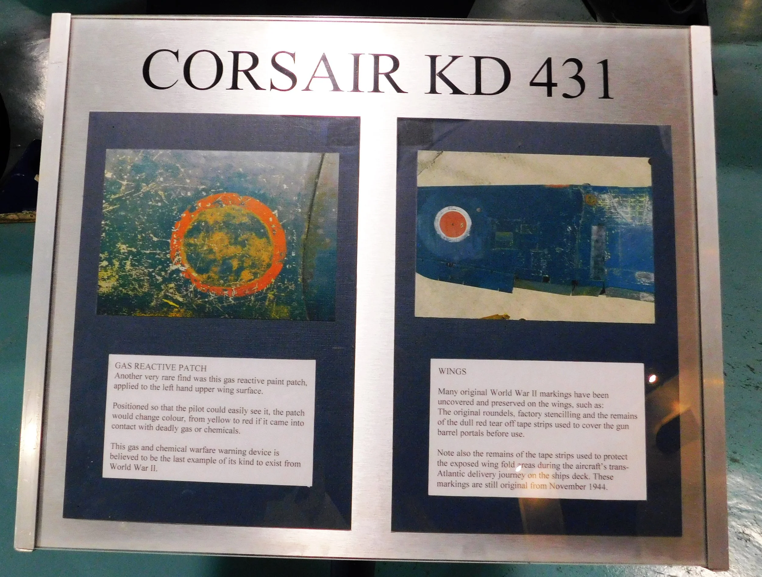 Another example of an aircraft on display that tells visitors much more than just basic information is this RAF Corsair KD 431. This plane has been the subject of many years of forensic restoration resulting in what may be the most original Vought F4U Corsair in existence. Like the Martlet above, very careful attention was paid to the paint layers on the aircraft and what they can tell about the history of the plane. Some of the findings are described on the placards. There were six levels of paint found, representing the different squadrons it was attached to.