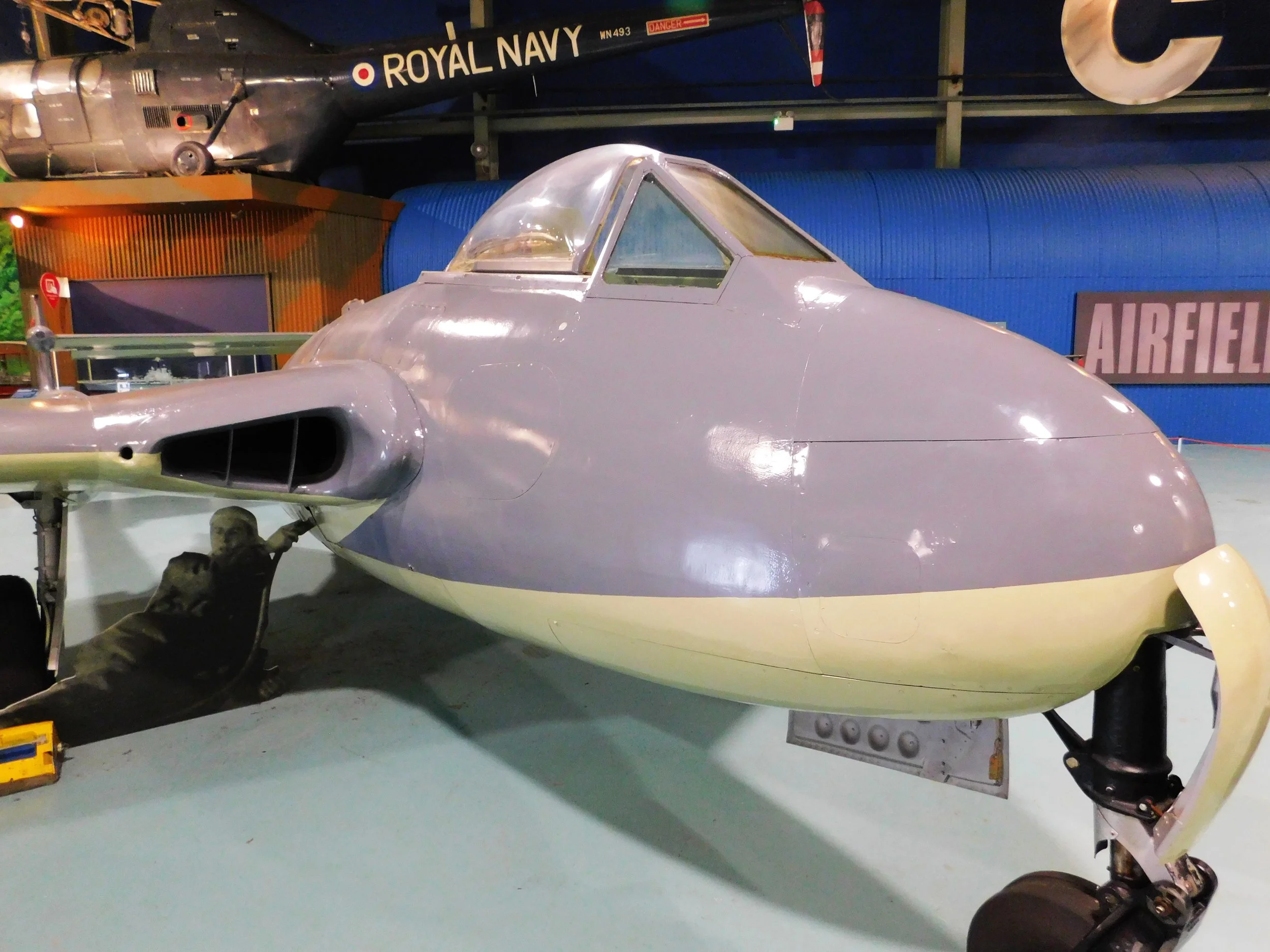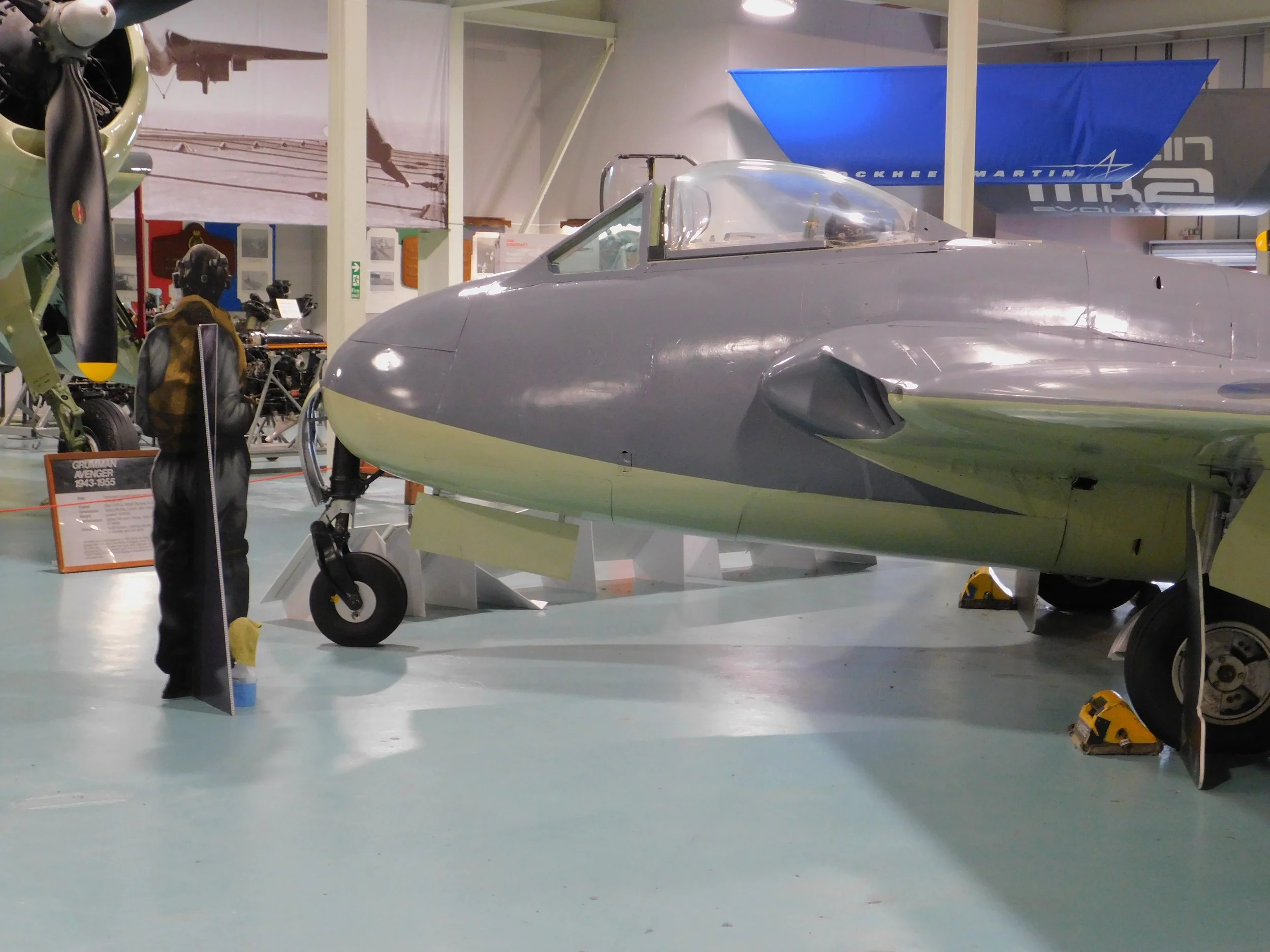 Having flown a 1950s era aircraft (Grumman C-1A) on and off aircraft carriers, I have a great respect for the skills required to operate off carriers of that time. The C-1, however, was a straight wing, piston powered plane- much easier to land on a carrier than a jet, especially early jet fighters. The de Havilland Sea Vampire was the first Royal Navy jet aircraft to land on a carrier (in fact, it was the first pure jet to land on any carrier). Lt Commander Eric “Winkle” Brown made the landing in December 1945 on the HMS Ocean, in less than ideal weather conditions. The plane he was flying, Sea Vampire LZ551/G is the aircraft on display.