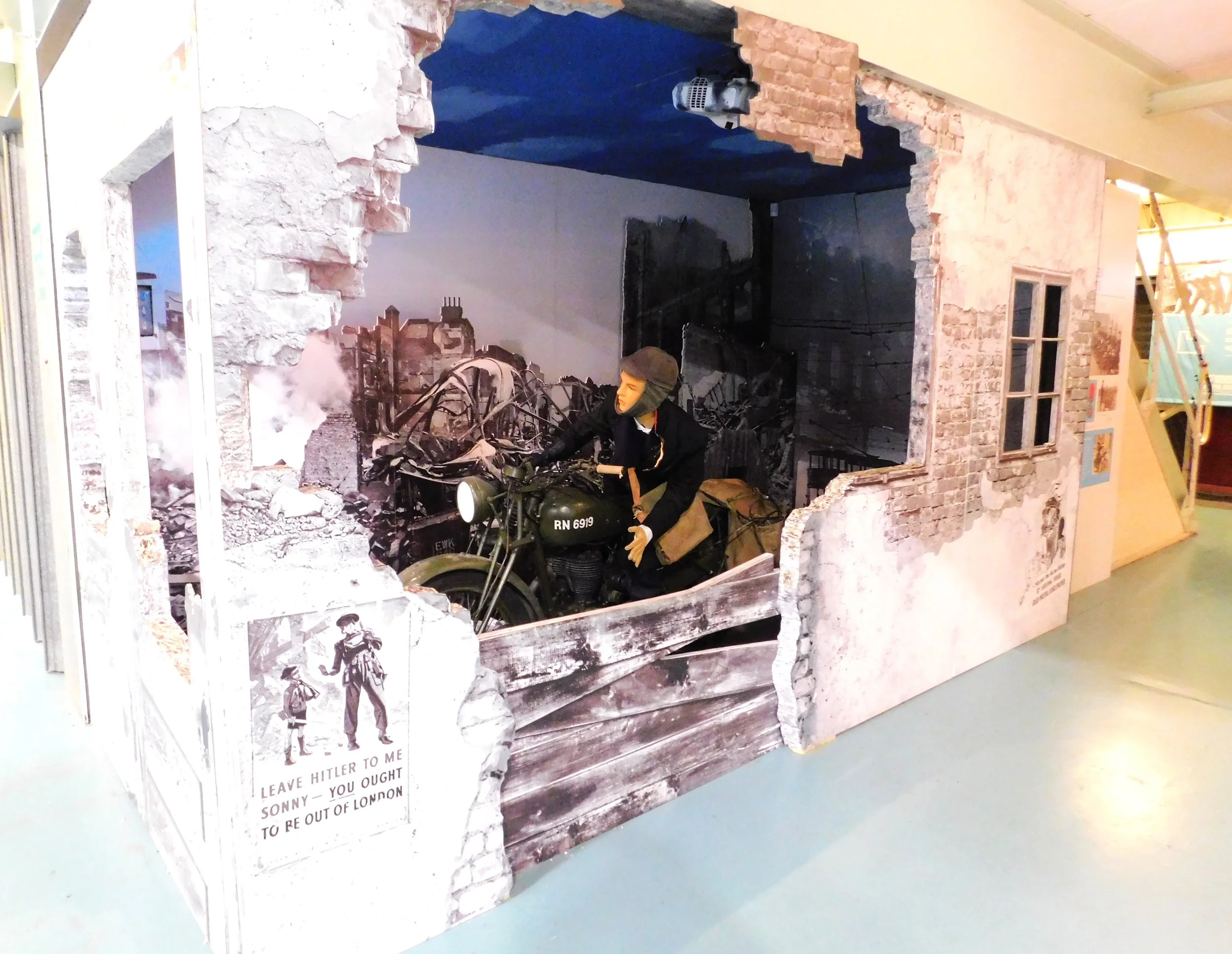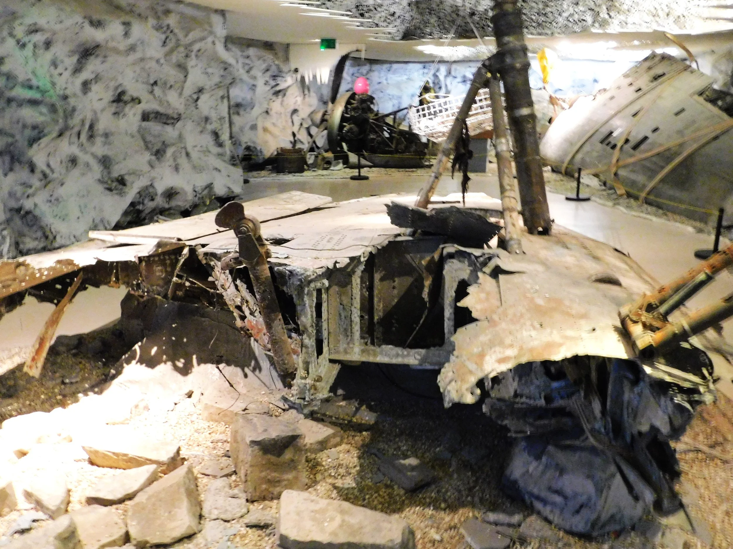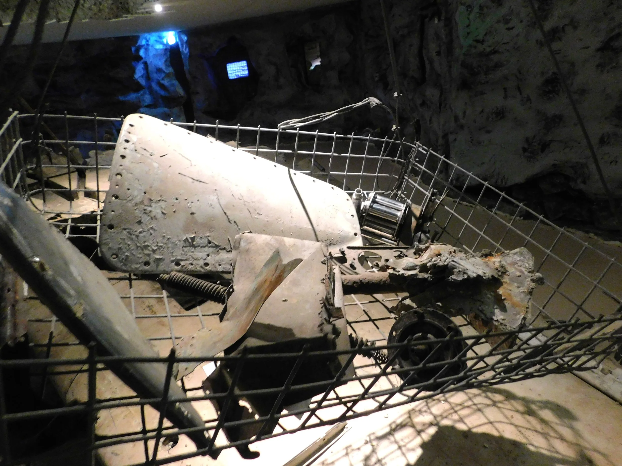 As you enter this room, you are in the middle of an underwater diorama, with the remains of a crashed aircraft in front of you. The plane is Blackburn B-24 Skua, L2940, which went down in a lake in Norway in 1940. Three Skuas from 800 squadron took off from HMS Ark Royal for a patrol flight. They spotted a Heinkel 111 and all three attacked, forcing the Heinkel down on a snowy mountain. One of the Skuas had engine problems and landed on a frozen lake in the same area. The crews of the two planes wound up finding the same hut on the snowy mountain and they worked together to survive. Eventually, they were found by a Norwegian patrol and the Germans were taken prisoner. This event was the basis of the film “Into the White”.