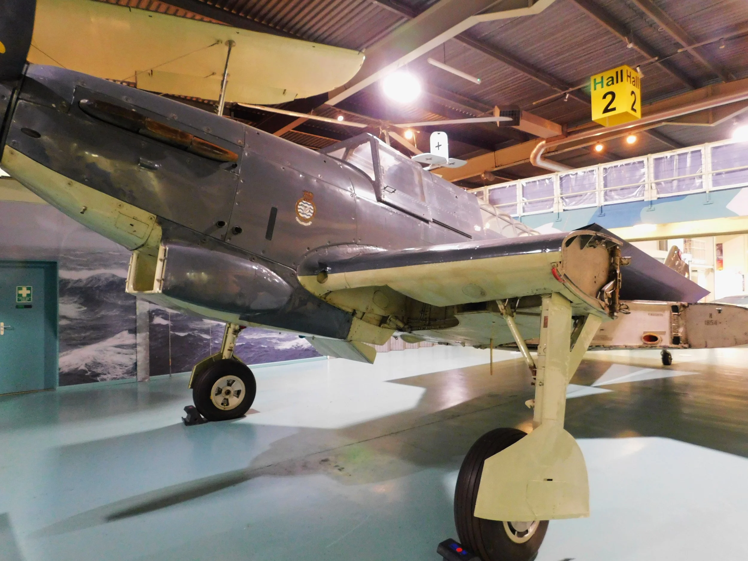The first plane you come to in Hall 2 is this Fairy Fulmar. Illustrating the vital need for military aircraft at the beginning of WWII, the Fulmar made its first flight in January of 1940 and was put into regular service in June of 1940. The Fulmar was not a spectacular performer, but it was sturdy and reliable and served well as a carrier-based reconnaissance and light bomber aircraft. It was also used as a night intruder aircraft. Powered by a Rolls Royce Merlin, 600 of the type were built.
