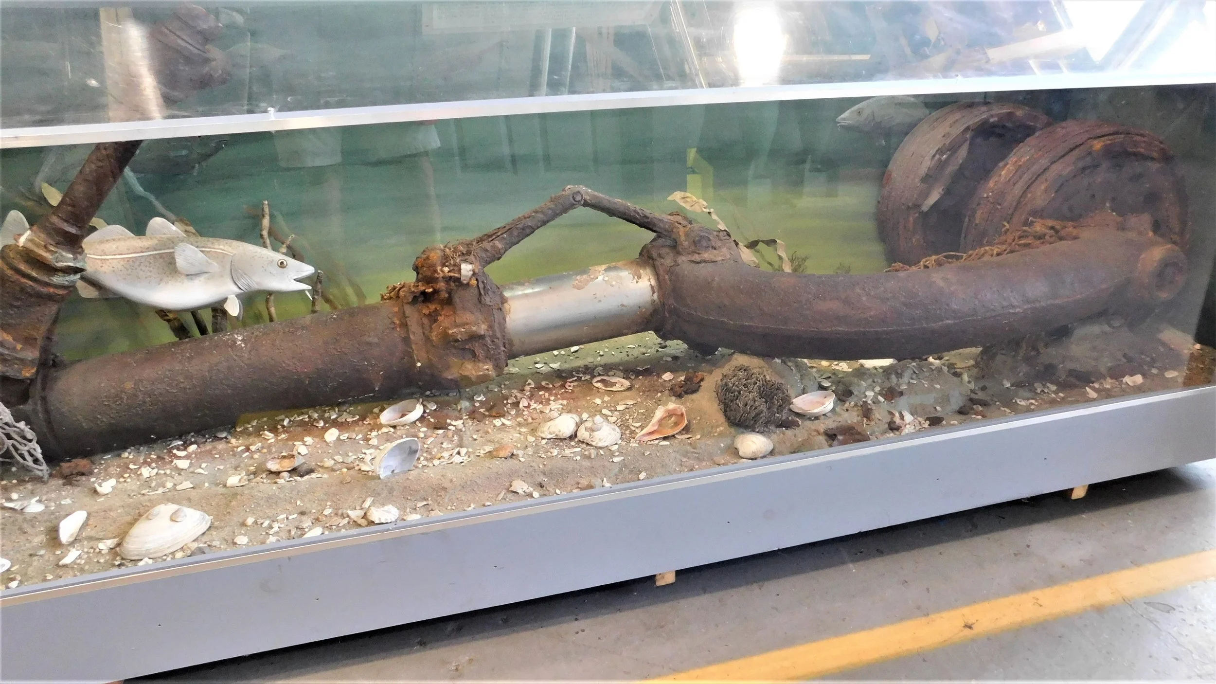 The American Airpower Museum on Long Island (issue 40) displays this landing gear that was pulled up in a fishing net off Shinnecock Inlet in 2013. It is assumed to be from a B-24 that went missing on a training flight in 1944. It is displayed in the condition in which it was found - resting on the ocean floor- actually in water (and it’s a live fish).