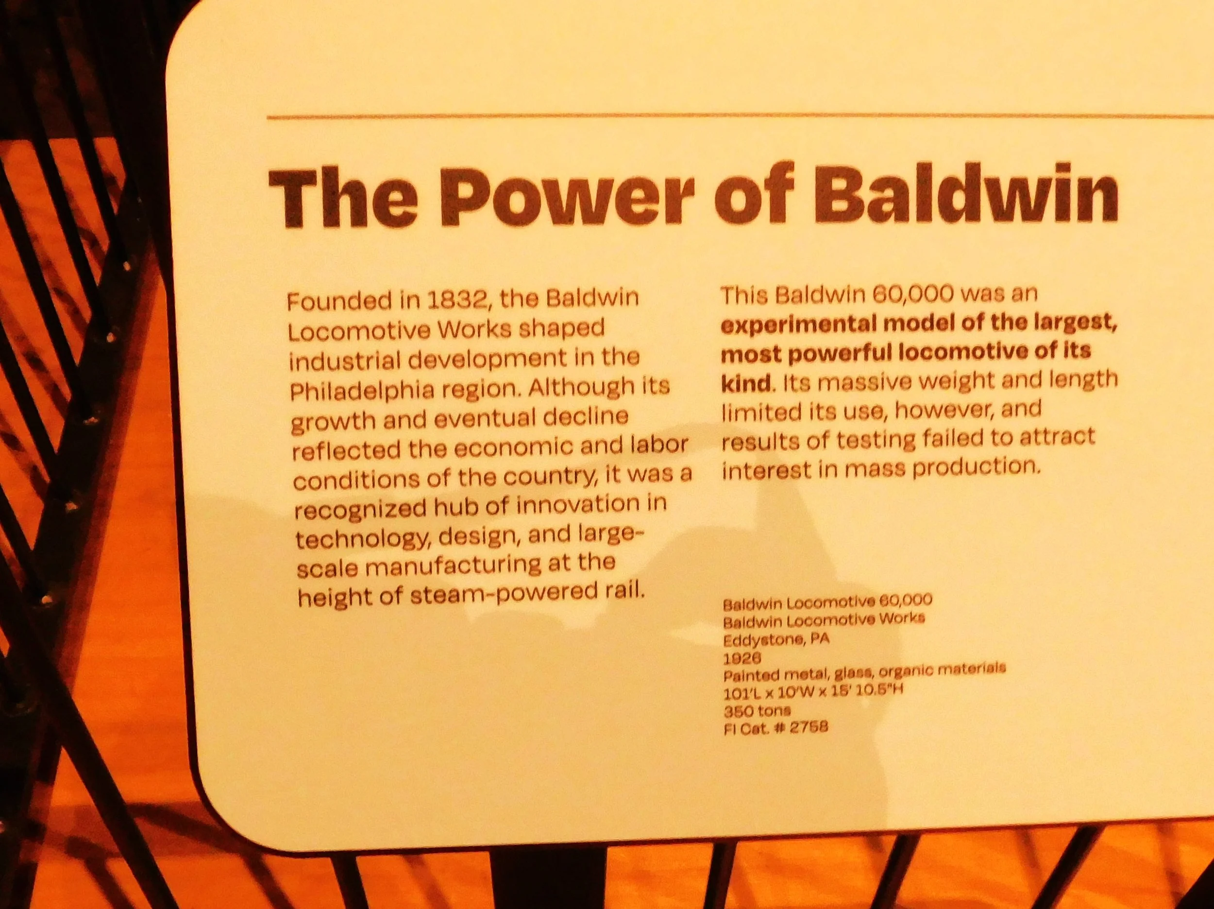 A third exhibit, which is always on my must-see list at the Franklin Institute, is this 700,900 pound locomotive- a Baldwin experimental steam engine. It bears the number 60000 to indicate it was the 60,000th locomotive built by Baldwin in the nearby Eddystone locomotive works.