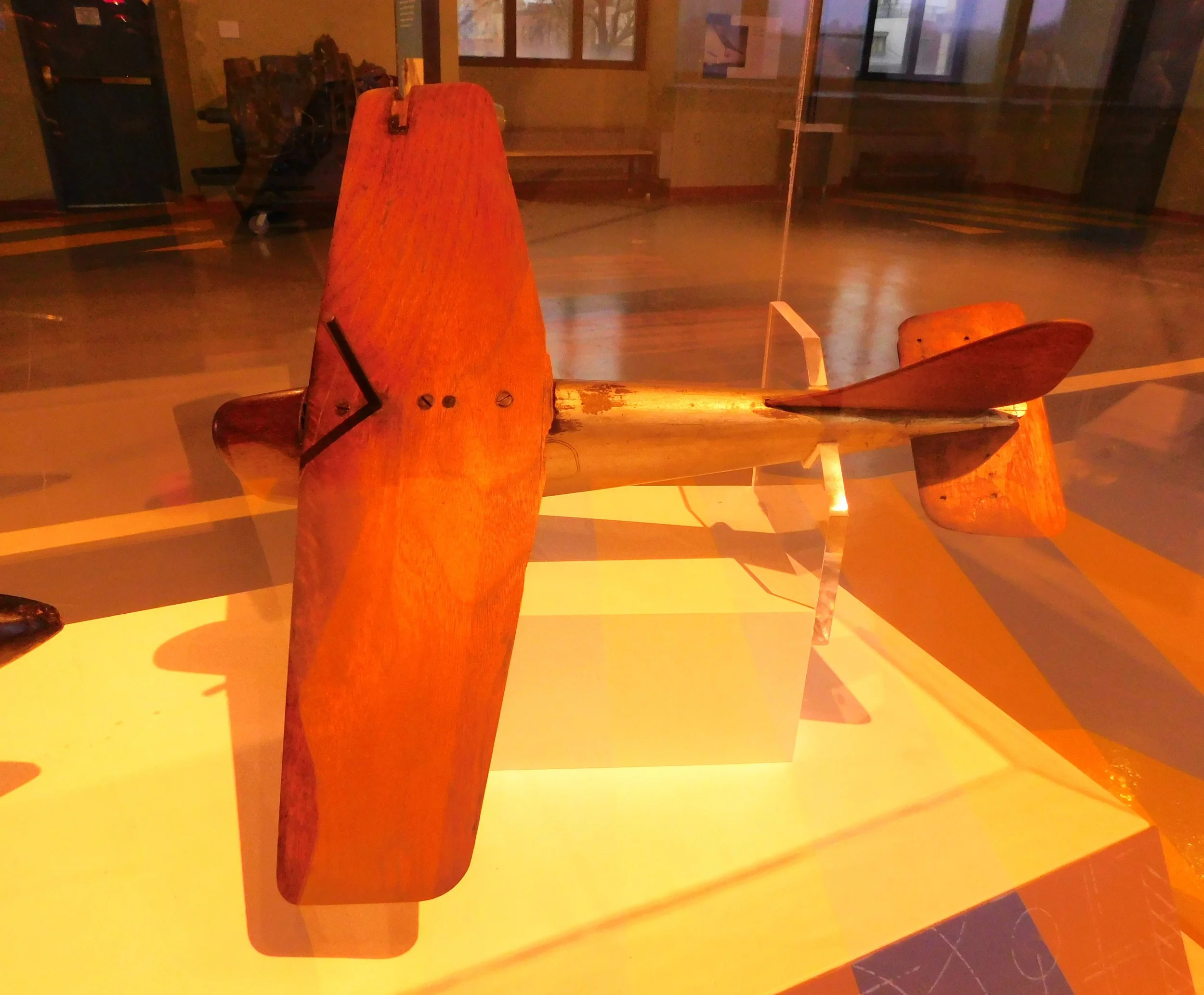 After their glider experiments in Kitty Hawk in 1900 and 1901, the Wright brothers were feeling a sense of failure. They had not made any progress in glider flying in 1901 and on the way home to Dayton, Wilbur famously remarked to Orville that “Not within a thousand years will man ever fly”. Not being willing to give up, though, they started evaluating their methods. They had been using data from the very successful glider builder and flyer, Otto Lilienthal. They decided to abandon his data and start from scratch. To this end, they built a wind tunnel to test various airfoil shapes. The original wooden wind tunnel no longer exists, but the Institute has an exact replica that was built in 1930. Above is the balance that was in the tunnel to hold the airfoils they were testing. The miniature airfoils are some of the actual ones that the Wright brothers made out of any scrap metal they had on hand. What they found was that Lilienthal’s data had been correct, but only for the one airfoil shape that he used. The wind tunnel tests showed a great variation in lift, drag, and balance created by different shapes. From these tests, the Wrights developed their own tables of data and these tests led to successful glider flights in 1902 and, of course, their first powered flight in 1903.