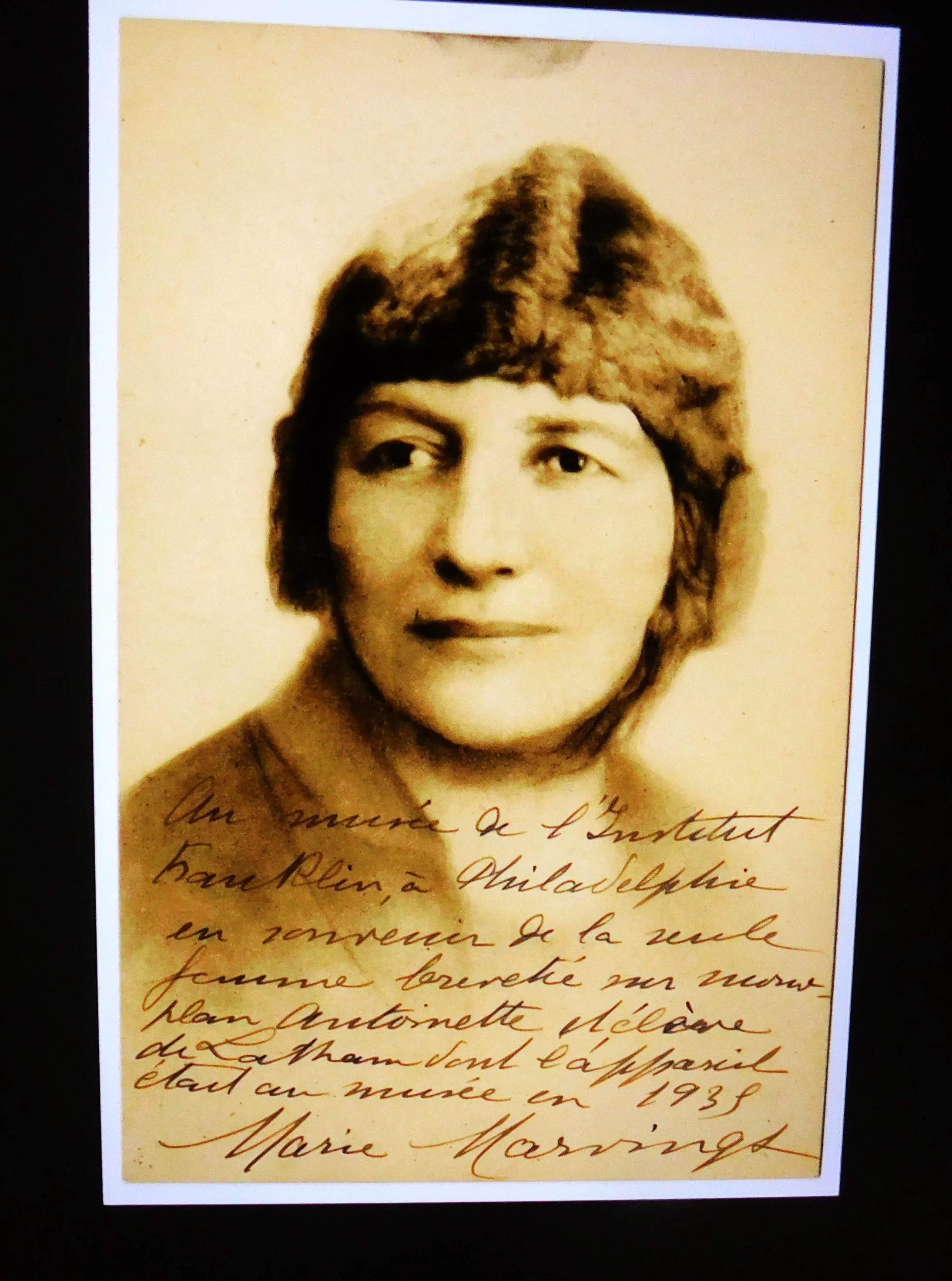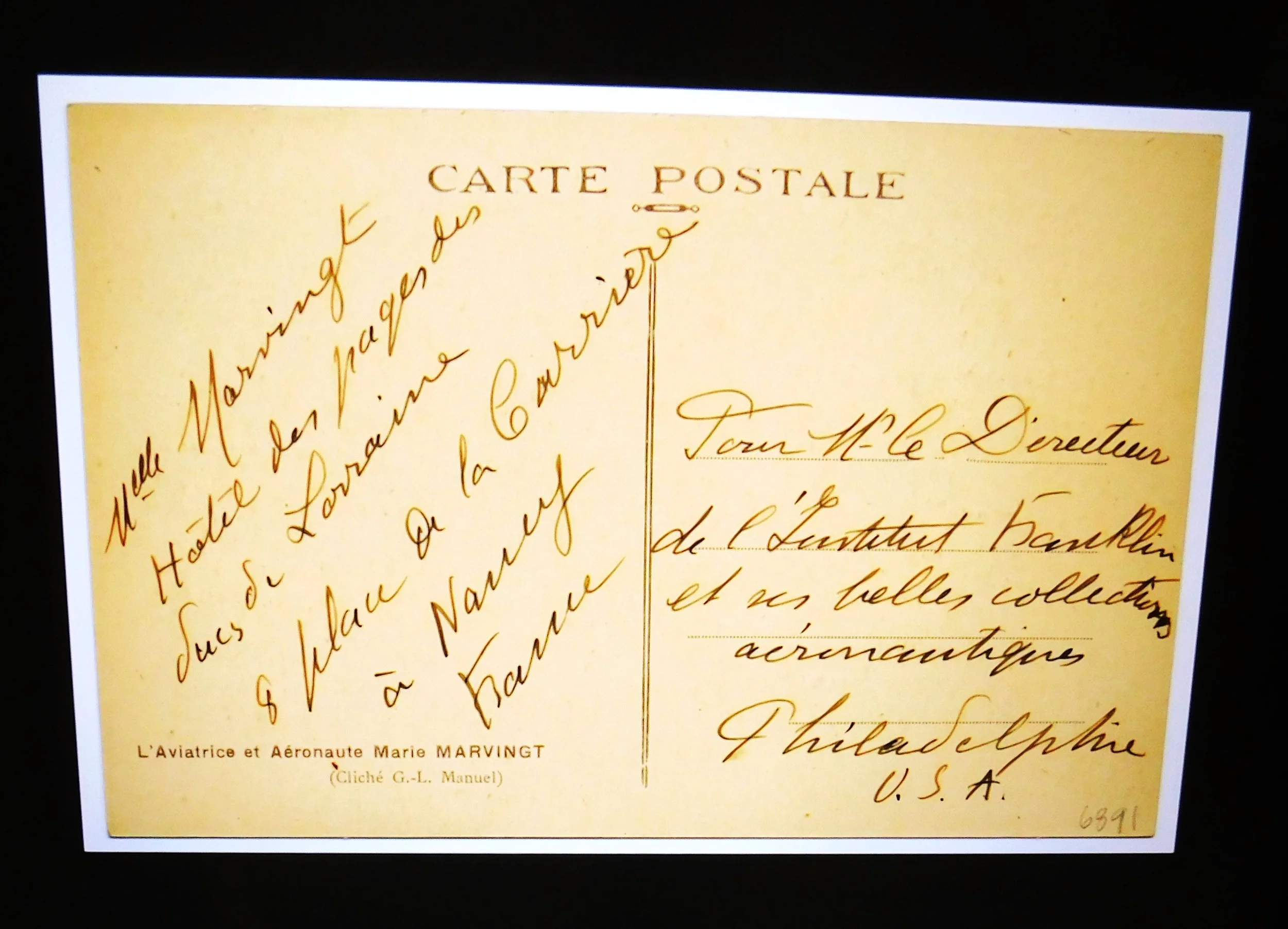 This postcard was received by the Franklin Institute in 1935, prior to Marvingt visiting the museum to give a talk. This simple artifact is displayed to illustrate and keep alive the story of Marie Marvingt, a true pioneer in aviation, who is little remembered in history, but deserves to be.