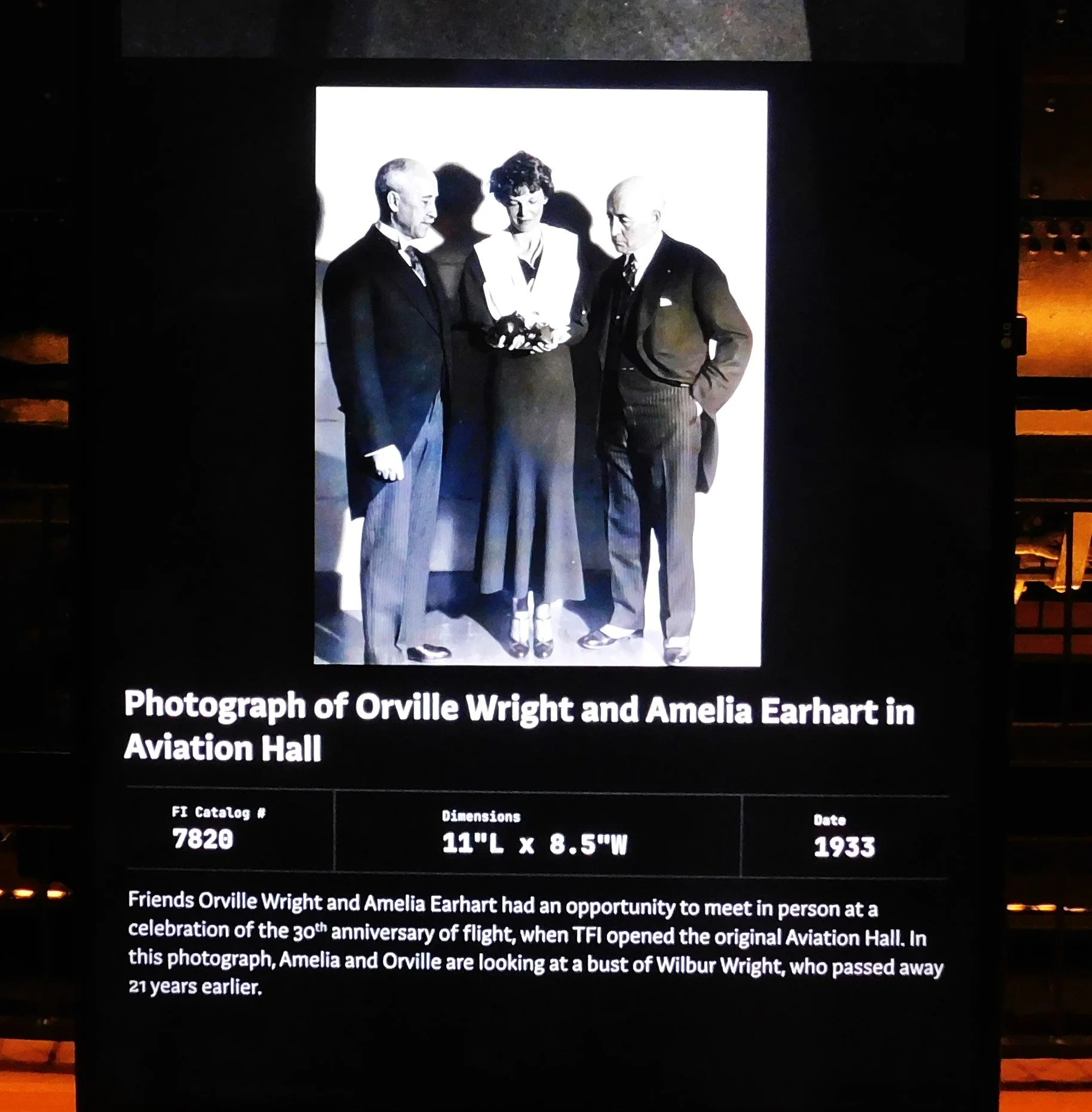 The items in the cabinets are all originals and range from every-day items to one-of-a-kind objects of historical significance. This photograph is of Amelia Earhart and Orville Wright at the Museum just after the new building opened, looking at a bust of Wilbur Wright.